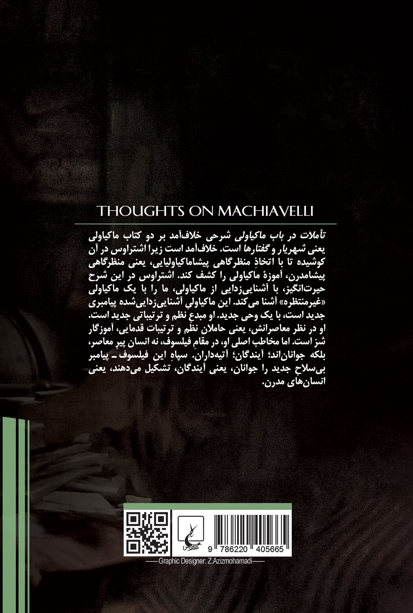 تأملات در باب ماکیاولی شرحی خلافآمد بر دو کتاب ماکیاولی یعنی شهریار و گفتارها است. خلافآمد است زیرا اشتراوس در آن کوشیده تا با اتخاذ منظرگاهی پیشاماکیاولیایی، یعنی منظرگاهی پیشامدرن، آموزۀ ماکیاولی را کشف کند. اشتراوس در این شرح حیرتانگیز، با آشناییزدایی از ماکیاولی، ما را با یک ماکیاولی «غیرمنتظره» آشنا میکند. این ماکیاولی آشناییزداییشده پیامبر جدید است، با یک وحی جدید. او مبدع نظم و ترتیباتی جدید است.