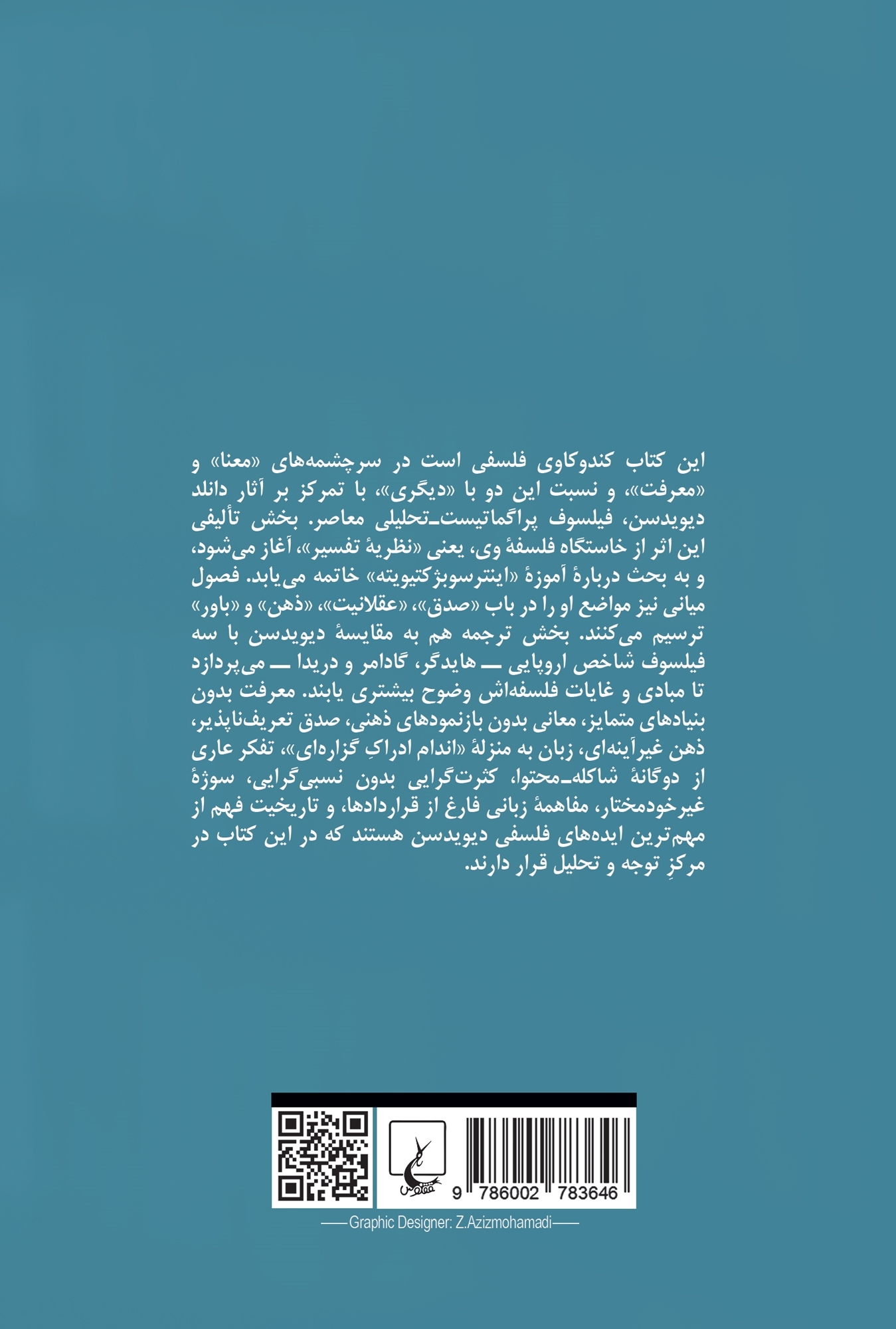 این کتاب جزءِ معدود آثار فارسی در تقریر و تفسیر آراءِ دیویدسن است. امیدست بتواند در عین آنکه تصویری از تحوّلاتِ جدید در حوزۀ فلسفۀ غرب به خوانندۀ علاقهمند ارائه دهد، منبعی مفید برای آشنایی با این فیلسوفِ دشوارنویس باشد.