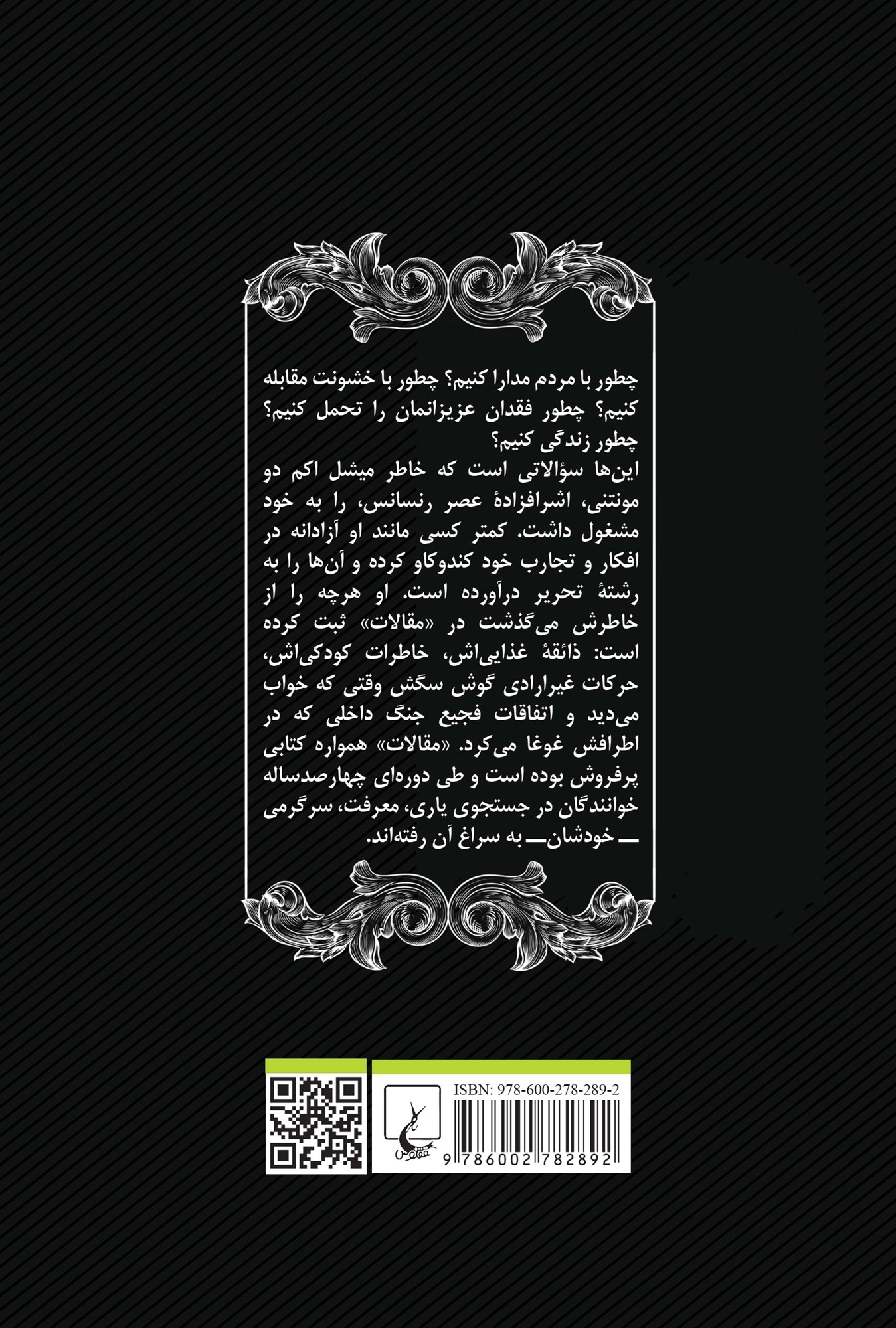 قرن بیست و یکم مملو از انسان‌هایی است که مملو از خویشند . اگر به فضای مجازی سری بزنید با هزاران نفر روبرو می‌شوید که مجذوب و شیفته شخصیت خود هستند و خواستار جلب توجه . همه آنها فکر و ذکرشان تعریف از خودشان است . آنها خاطره‌نویسی و چت می‌کنند و از هر کاری که می‌کنند در صفحات اینترنتشان عکس می‌گذارند . این ایده – یعنی نوشتن درباره خود به منظور خلق آینه‌ای که مردم در آن به انسان بودن خود پی ببرند – همیشه وجود نداشت بلکه باید ابداع می‌شد . برخلاف بسیاری از ابداعات فرهنگی می‌توان این ایده را تنها به یک فرد نسبت داد : « میشل اکم دو مونتنی » ، یک نجیب‌زاده و دولتمرد که از سال 1533 تا 1592 در منطقه‌ای در جنوب غربی فرانسه به نام « پریگور » زندگی می‌کرد . او این ایده را صرفاً با انجام دادن آن ابداع کرد . او ، برخلاف بسیاری از شرح‌حال‌نویسان زمان خود ، شرح حال خود را به منظور ثبت موفقیت‌ها و دستاوردهای خود ننوشت . او کتاب خود را در سال‌هایی نوشت که جنگ‌های مذهبی و داخلی کشورش را به نابودی کشید . او که متعلق به نسلی محروم از ایده‌آلیسم امیدبخشی بود که همعصران پدرش از آن بهره‌مند بودند ، با تمرکز بر زندگی خصوصی‌اش خود را با بدبختی‌های جامعه وفق داد . او به نوشتن قطعاتی درباره دوستی ، نام‌ها ، بی‌رحمی‌ها ، تغییر رویه و . . . مبادرت کرد و در مجموع صد و هفت مقاله نوشت و به پرسش اخلاقی « انسان چطور باید زندگی کند » پرداخت .